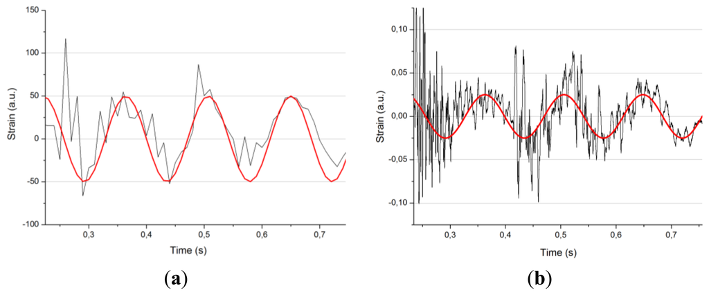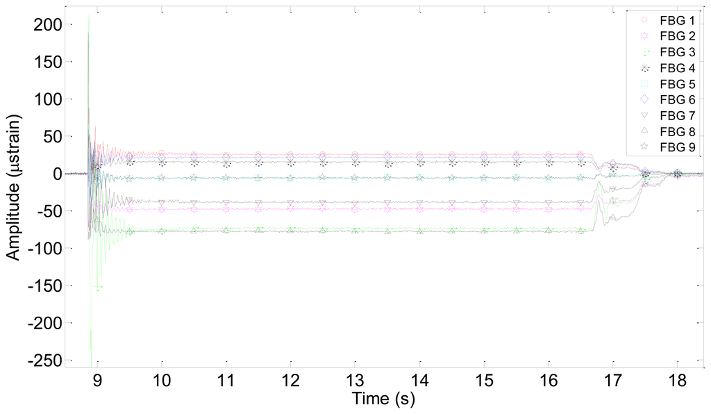 Figure 7 shows the results corresponding to an impact in detail. Notice that, in this case, it is impossible to distinguish the exact moment in which the strain waves reach each of the FBGs, which makes it very difficult to determine the distance from each FBG to the impact point with accuracy. The problem arises because the speed of our interrogator to detect variations in the wavelength at each Bragg grating is too low to clearly detect the waves generated by the impact. In Section 3.1 we discuss in detail this problem and we give a solution to this question.