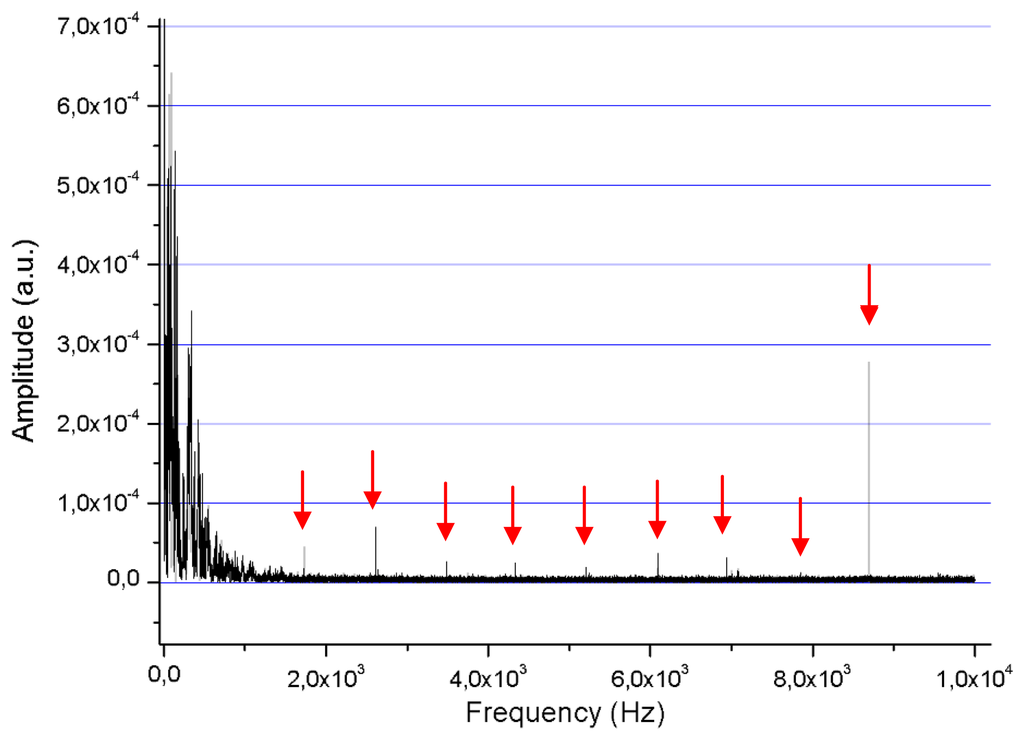 The peak frequencies, marked in red in the previous figure, are the following: 1,726 Hz, 2,606 Hz, 3,485 Hz, 4,334 Hz, 5,211 Hz, 6,091 Hz, 6,937 Hz, 7,851 Hz and 8,697 Hz. These frequencies correspond to the natural frequencies in torsional and flexural modes [12], although the calculus of the frequencies of this complicated structure is out of the scope of the present paper.