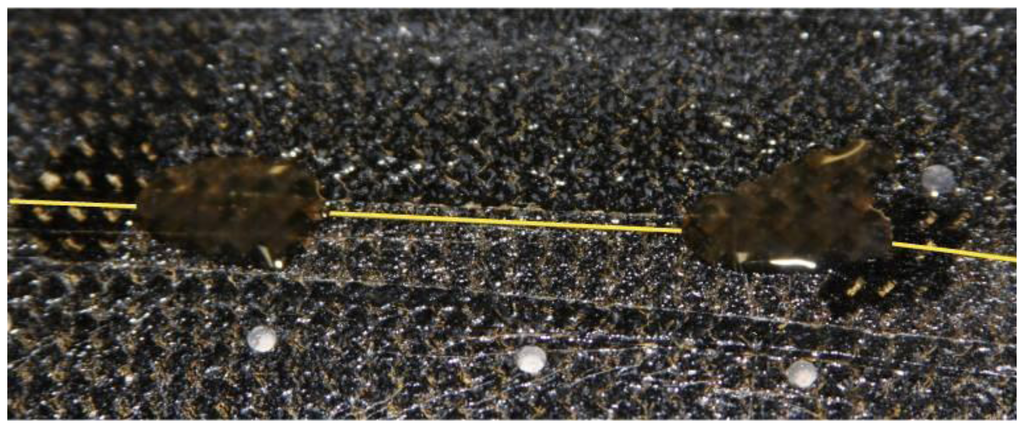 A strict procedure was followed to mount the fiber on the specimen. First, the surface was cleaned with a degreaser to remove any traces of dirt or grease. Then, this surface was polished using 400 grit sandpaper and wiped again with a conditioner. Finally, the pH was adjusted to be optimal by means of a neutralizer. The bonding method followed is similar to that usually applied to strain gauges, and the result is shown in Figure 2, which a photograph of the mounted Bragg grating. The adhesive chosen was the M-Bond AE10, which is recommended by the manufacturer of FBGs for such applications.