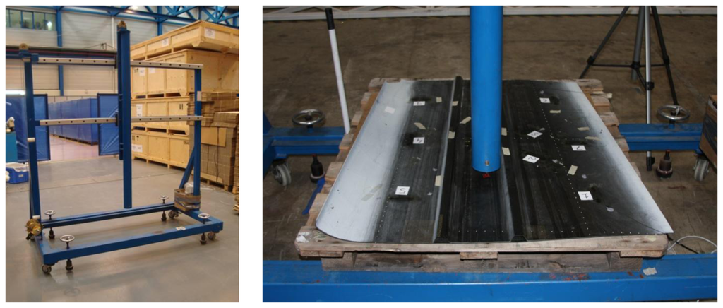 The specimen used to assess the effect of impacts on its surface is a piece of Carbon Fiber Reinforced Polymer (CFRP) with two stringers on the underside. The top side of the piece is finished with a white protecting coat (painted). The bottom, on which the FBGs were installed, has no special finishing, so this surface was more suitable to achieve a greater adhesion of the fibers (Figure 1). The size of the piece is 111 × 80–95 × 0.15 cm (length × width × thickness). The stringers were arranged in a parallel pattern. The piece is a part of the outer skin of a standard mass-produced aircraft.
