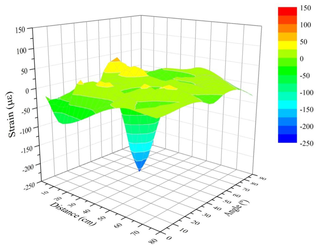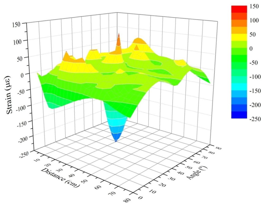 Figure 5 shows, graphically, the results corresponding to the residual strain before an impact test for all the impact points using the mass of 2.5 kg. Figure 6 contains the results for the 10 kg mass. We expected to get the highest values near to the Bragg sensor (0 cm) and longitudinally (0° angle). However due to the inherent physical properties of the CFRP sample, which make the structure behave as an anisotropic body, the strain in different places does not correspond to a theoretical distribution in a simpler isotropic material (such as a metallic sample). The fact that the overall structure of the sample (not the composition of the layers) includes stringers and reinforced areas also enhances this non-linearity of the responses received by the sensors when measuring the arrival time of the wave created by the impacts. Therefore, we can obtain wave-arrival-time measurements that are different from the expected ones in an isotropic material. This leads us to believe that the results obtained and reflected in the next charts (Figures 5 and 6) are correct. The next Figure 6 shows the results corresponding to all impact points and the mass of 10 kg.