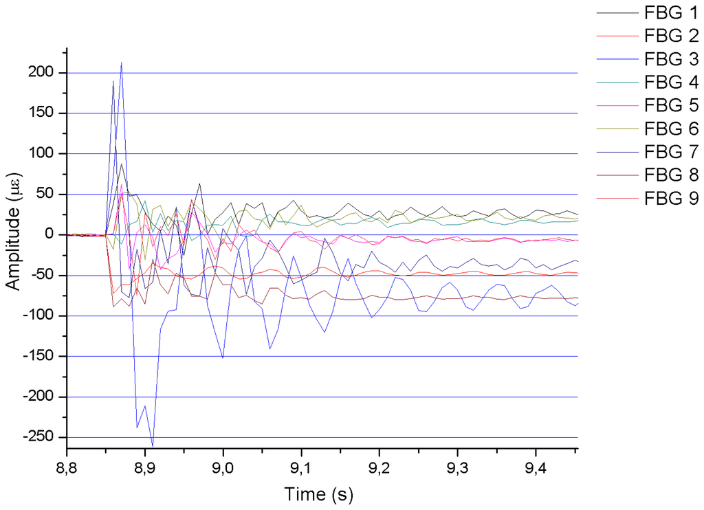 As an example, Figure 4 shows the results obtained for impact point No. 3 during test No. 8. Most of the graphs have very similar shapes, although, as expected, the amplitude increases when increasing the impact energy. In all cases, the response of the FBGs is a damped oscillation (a sinusoidal-like curve with an exponential decrease of its amplitude with time).