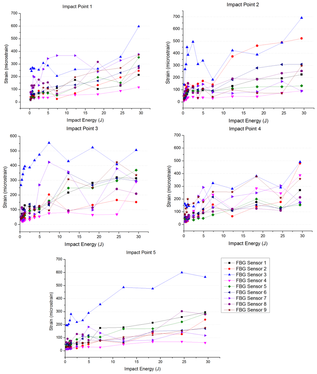 On the other hand, the amplitude corresponding to the strain signal detected by each Bragg grating has been related to the energy of the performed impacts. As a representation of this relationship, we have obtained the graph shown in Figure 8. This graph represents the difference between the maximum and minimum strain values at each FBG sensor, the impact point being the same in all curves, when using increasing values of the energy applied in the impacts. It can be observed that the amplitude of the measured strain increases as the impact energy does. In all the performed tests, the maximum amplitude is collected at Bragg grating 3, located just in the center area of the specimen.
