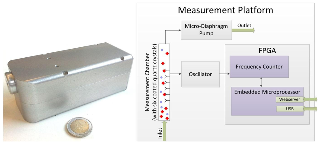 Different from other approaches (e.g., [–]) we focus on the online detection of analytes in an airstream without using a preconcentrator. As real-time tracing of very dilute specimens is very desirable, a high sensitivity (in terms of high readout per unit analyte) of the whole sensor is pivotal. This can be achieved by tuning both the chemical and the engineering parts. Our development and selection of appropriate affinity materials for the chemical interaction has been described elsewhere [,]. The general setup is depicted in Figure 1.
