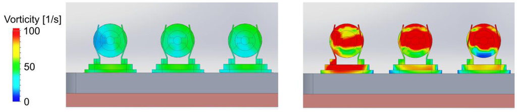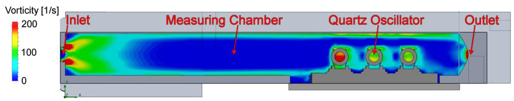 Figure 9 displays the result of the numeric simulation. Impressively clear, the vorticity has its maxima at the inlet and at the location of the quartzes. The turbulences seem to build up a turbulent layer on the wall of the measurement chamber. This layer promotes vortices at the quartz surface. This will cause mechanical stress onto the quartz surface and most probably leads to noise in frequency.