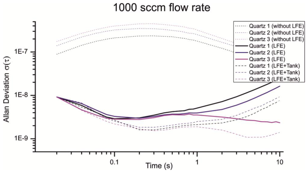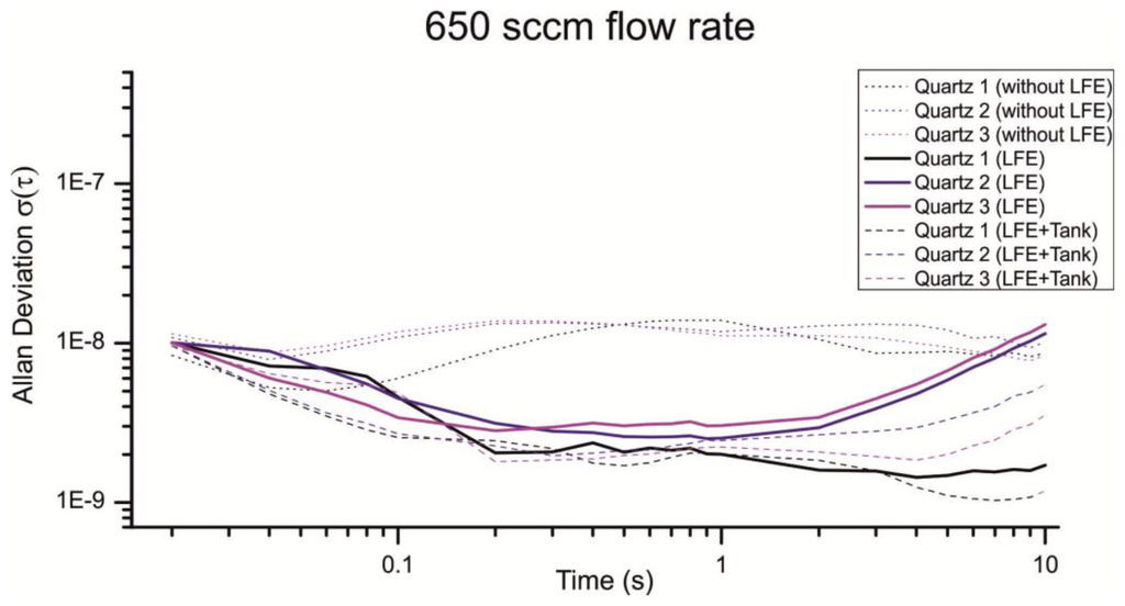 Especially the Allan deviation of Quartz 1 with an air flow of 650 sccm (Figure 14, Quartz 1 LFE) indicates additional noise sources beside the 1/f noise, random walk and turbulences. For smaller flow rates the pump cycles are reduced, which lead to an irregular flow and a non-optimal load of the pump motor. An additional volume can be used to smooth the uneven airflow. Figures 13 and 14 show the resulting Allan deviation with an additional tank of ≈800 mL. The minimum Allan deviation is reduced to 2∼3 × 10−9 for both flow rates. Therefore the uneven air flow could be identified as another source in noise. However, the SNR can only be reduced a little which shows that a turbulent airflow is a major noise source. Compared to other existing QMB devices with an Allan deviation in the range of 10−6 to 10−8 we measured an excellent minimum Allan deviation τ(0.2s) ≈ 2∼3 × 10−9 with a constant air stream of 650–1,000 sccm.