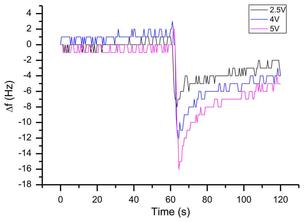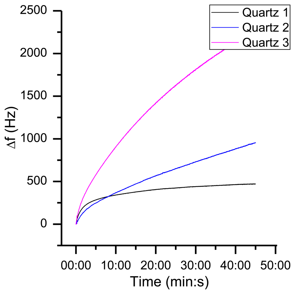 Following Equation (1), a most practical way to increase the absolute frequency shift of a QCM device is the employment of a quartz crystal oscillator with higher operational frequencies. This can be achieved by higher fundamental frequencies, overtones of common quartz crystals or using completely differently acoustic sensor techniques (i.e., SAW, FBAR). As discussed by Vig [] several factors (aging, Q-factor, accuracy) will influence more strongly high-frequency quartzes and diminish the better theoretical absolute frequency shift. Yet, there are today even 8 GHz thin film oscillators [] and several other reported systems in the range >100 MHz.