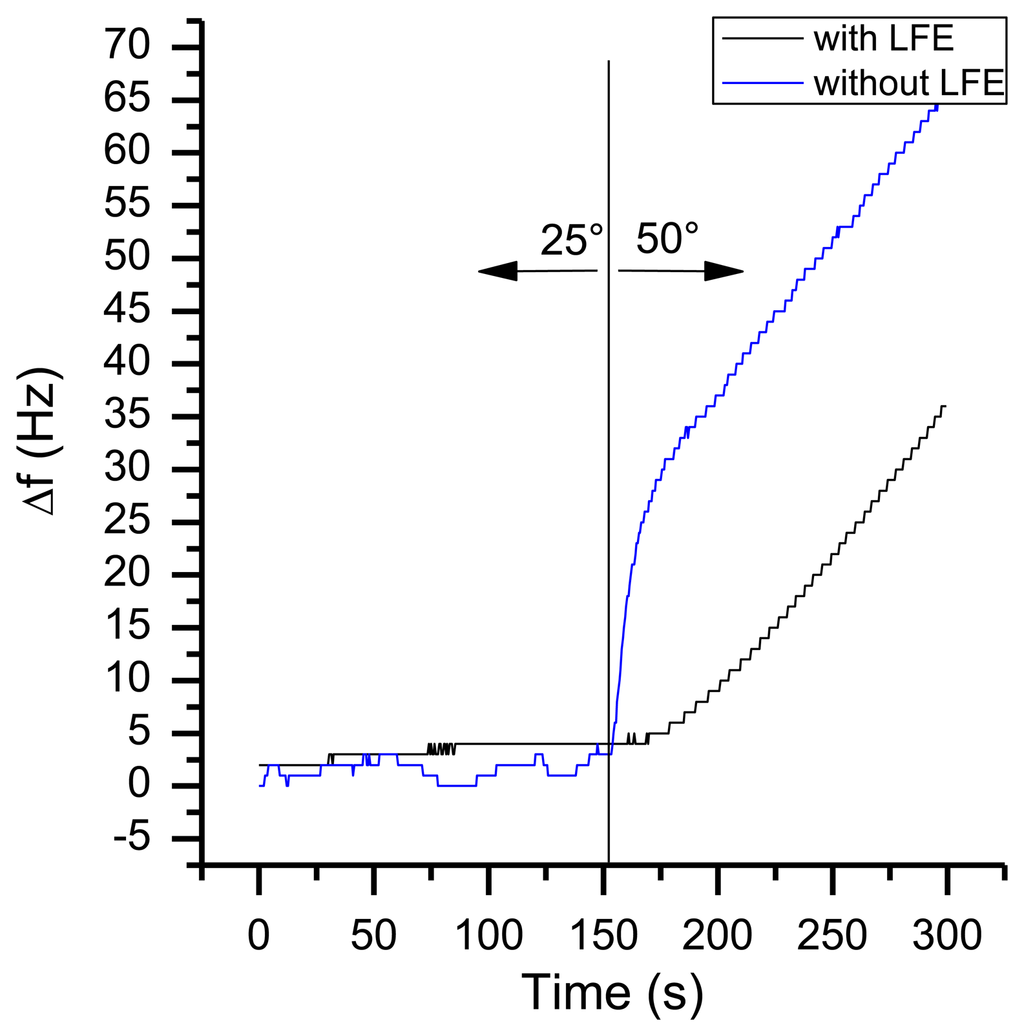 In a typical environment of a handheld sensor, temperature changes of more than 10 °C are possible. Figure 16 shows the frequency response of a changing environment. The sensor with an active pump was put from room temperature of 25 °C to an oven with 50 °C. As it can be seen, the sensor system with LFE shows just a small change in frequency with a maximum frequency slope of 1 Hz/s, whereas the system without LFE has a maximum slope of 3 Hz/s. Therefore the heat is equalized to the sensors temperature by passing the set of 1 mm cannulas. As a result, altering the absolute temperatur has just a small influence onto QCM measurements when using a heat compensation as the LFE. Like the warm-up behaviour, this kind of frequency shift can easily identified by mathematical filters.