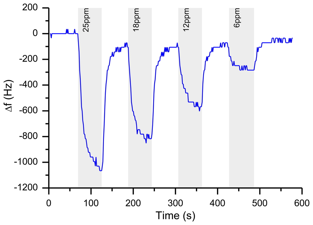 With these results in hands, the system was pushed further to the “real world”, i.e., into an air stream. The influence of the atmospheric pressure on QCM frequency was well analyzed in different reports by Kokobun et al. []. Atmospheric pressure can produce a deformation of the crystal which can change the capacity and cause mechanical stress.