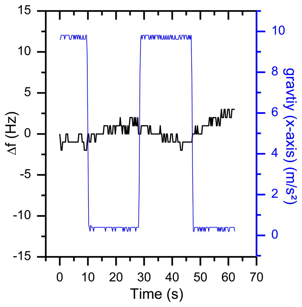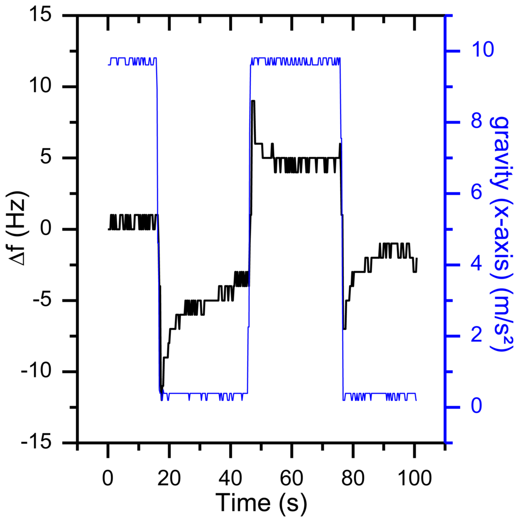 Taking Equation (4) and a frequency shift of 35 Hz (as shown in Figure 18) into account, the value of the g sensitivity in direction of the x axis Γ⃗x is 9.2−9 g. For many applications, this is a reasonable result. However, in this setup, an orientation-dependent instability of 35 Hz reduces the resolution of the QCM dramatically. First indications that temperature effects might be involved in orientation-based signal shifts were observed when repeating the same experiment during the warm-up period of the oscillators (Figure 19). With a warming oscillator, the amplitude of the frequency changes increases as well.