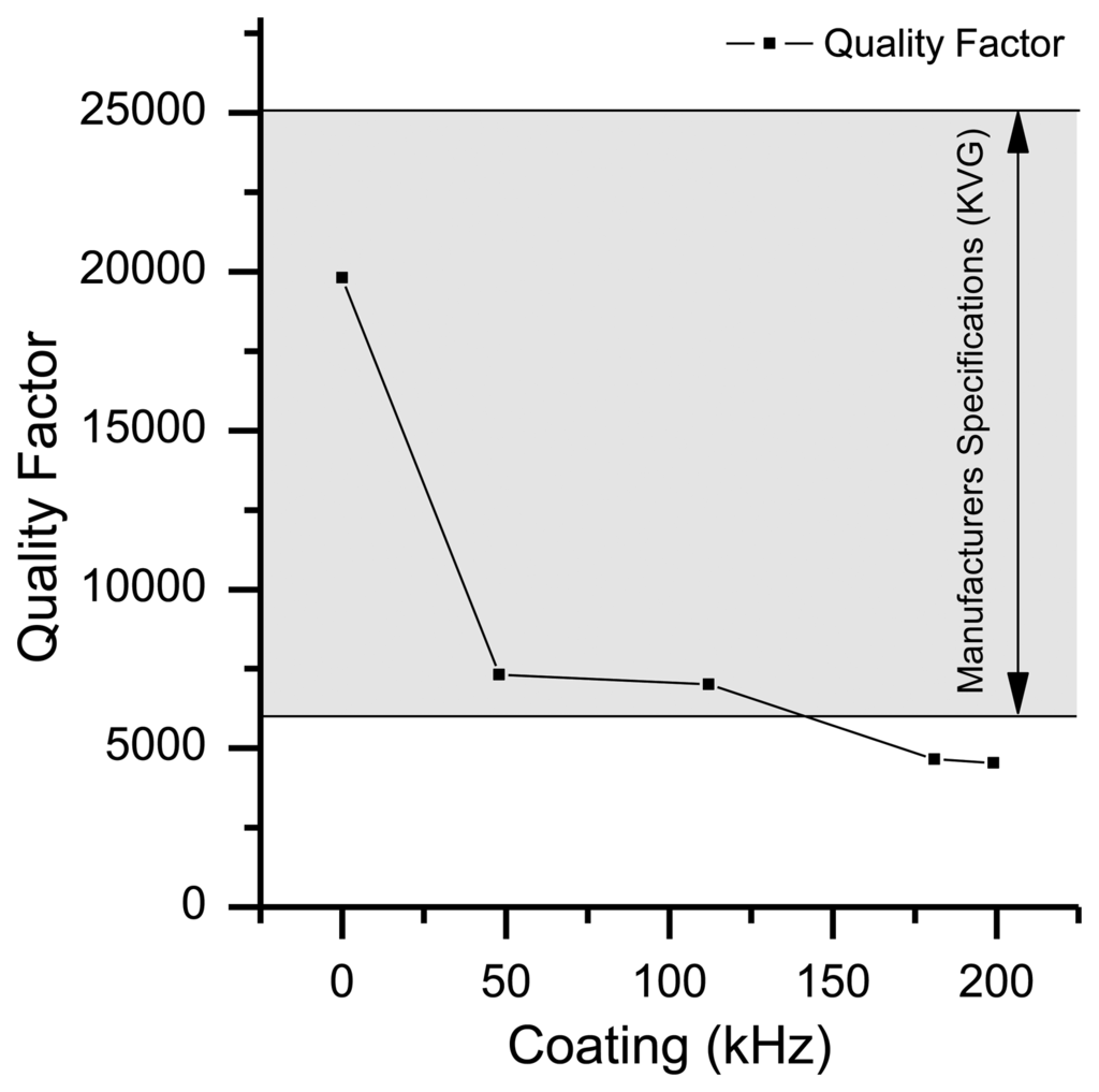 The quality-factor (Q-factor) is a measure for the quality of the quartz oscillator and is defined as the ratio of stored energy to dissipated energy. It is inversely proportional to the random fractional frequency fluctuations or short-term instabilities of a quartz oscillator. Therefore the Q-factor is an important factor for the signal-to-noise ratio (SNR) of a measurement. According to Warner [] the theoretically maximum attainable Q-factor for AT-cut crystals should be in the range of 1.6 × 106 for a 10 MHz quartz oscillator, whereas the theoretical maximum Q-factor for a 195 MHz quartz oscillator is limited to 8.2 × 104. Due to additional losses this theoretical value is not reached in practice, especially when the quartz is not hermetically sealed like in a QCM application. Commonly the Q-factor varies from 102 to 4 × 105 in air [,]. The 195 MHz HFF-Quartz crystals are specified with a Q-factor of 6 × 103 to 2.5 × 104 (cf. Figure 3). Under atmospheric conditions we measured a Q-factor in the range of 1 × 104 to 2 × 104.