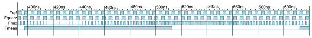 To achieve fmeas≪fref, the frequency of the crystal oscillators has to be converted into a low frequency. This is often done by analog mixing (e.g., []). Unfortunately this needs high design efforts resulting in larger devices compared to forward counters with a fixed gate time.