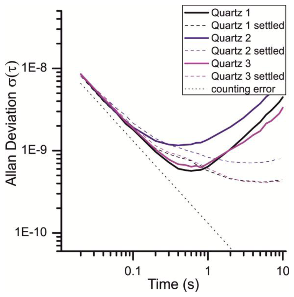 The subsequent Allan plot show three quartz crystals: Quartz 1 is an uncoated crystal, Quartz 2 and Quartz 3 are coated with two different compounds (50 kHz “film thickness” each). Among fabrication variation between individual quartzes, the difference between the shown results is attributed to the viscoelastic properties and the mechanical coupling of the different compounds to the quartz surface. As this report does not focus on the variation of quartz behavior upon different coatings, the three different quartzes were just investigated to expand the sample range and to show that the discussed effects are of more general nature.