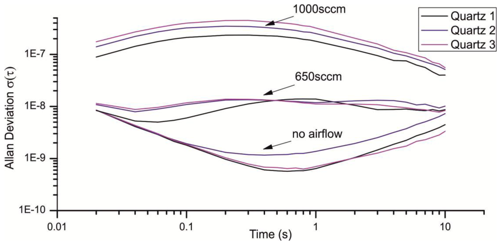 However, in an online detector with a stream of air passing the quartzes, short-term pressure fluctuations might have the most relevant influence on signal stability. In our sensor system, the double-headed micro diaphragm pump NMP015 manufactured by KNF Neuenberger (Freiburg, Germany) with a maximal air flow of 2,200 sccm (standard cubic centimeters per minute) was used. The array of quartz crystals is located in a measurement chamber with 13 mm diameter. Figure 8 shows the resulting Allan deviation at different flow rates. For a flow rate of 0.08 m/s (650 sccm) the Allan deviation increases by more than one decade, for a flow rate of 0.13 m/s (1,000 sccm) to more than 10−7.