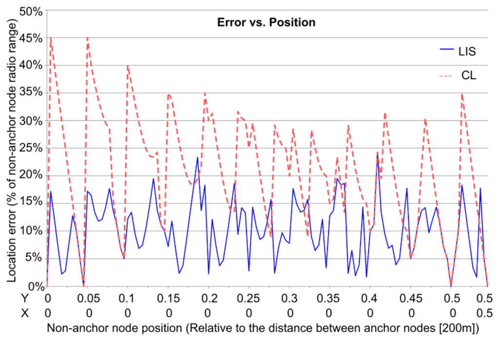 LIS obtains the position with a combination of two algorithms; one algorithm is based on a local node that uses a fuzzy system to obtain a partial solution, and the other algorithm is based on a centralized method, which is executed in a base station or a cluster-head that merges all of the partial solutions. Figure 10 shows the localization error of LIS compared with the Centroid Localization (CL) algorithm [17].
