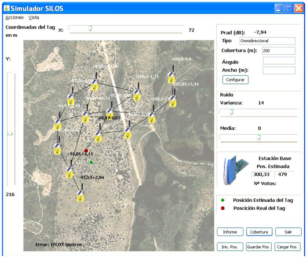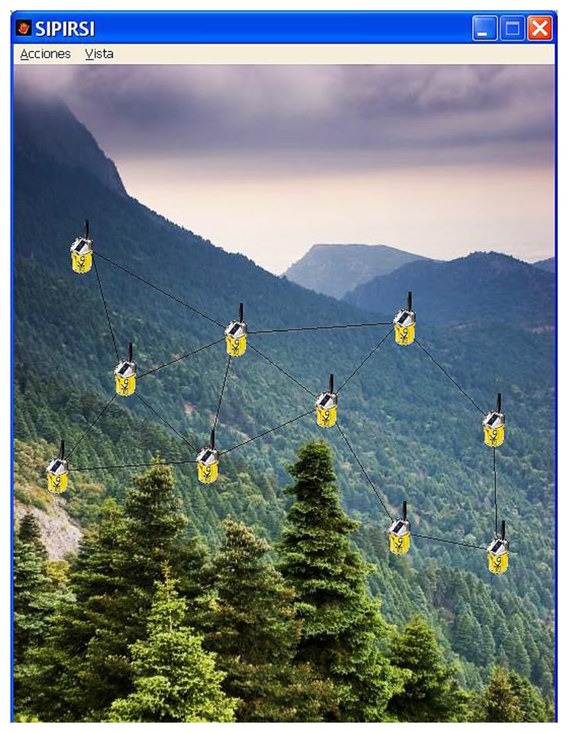 For these reasons, for localization purposes, it would be better to use implicit characteristics in communications, such as connectivity, number of hops or RSSI (Received Signal Strength Indicator). The measurements that are related to these parameters are currently integrated in most radio devices. These measurement techniques are based on the beacons' transmissions between the devices. The LIS algorithm is designed by taking these characteristics into account. Figure 9 shows the graphics environment of the LIS algorithm, which is designed for the ICARO 1 network.