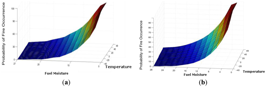 Fortunately, in recent years, no wildfires have occurred in this area, and the accuracy of the system has been tested by using an ad-hoc simulator (Figure 12) that implements the proposed algorithm. This algorithm is compared to the results that were obtained from Be-have Plus, which is a classical tool that is used in forensics fire analysis [20]. In Figure 13, we depict the probability of fire obtained through our system as well as the probability of ignition obtained by the Behave Simulator, respectively. Both figures show the probability as a function of temperature 40–49 °C and fuel moisture 1–27%.