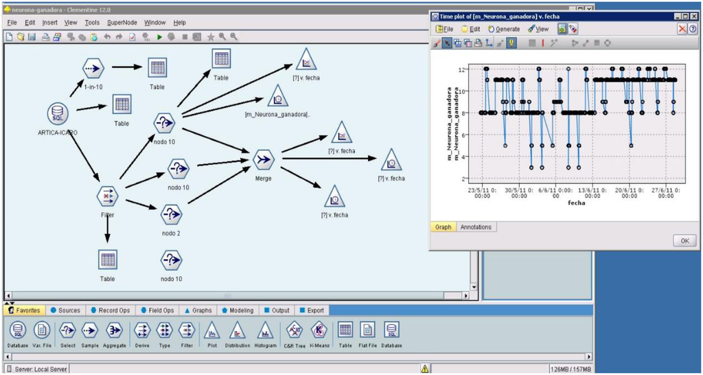 Until 2013, all of the sensor information was gathered from our networks in a classical manner, i.e., each deployed WSN had its own base station that collected sensor node information and sent it to the central server in Doñana, using open-middleware that allowed us to access the information through the internet. The developed middleware allows the representation of the information on a webpage and uses the data with other tools, such as data mining tools (Figure 21).