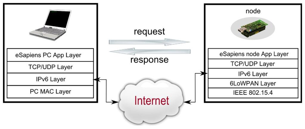 eSapiens is based on CoAP [51], a UDP protocol that is designed specifically for maintaining the low power consumption of WSNs. With eSapiens, each node stores its own information, allowing direct access to the information through the Internet, i.e., each node acts as a local server, drastically increasing the reliability of the network.