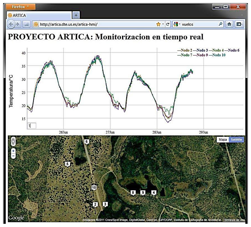 The initial ARTICA 1 network was composed of four nodes that were spread over an area with a distance of up to 200 m between them. These nodes were designed to read the environmental monitoring information from the sensors every minute, sending the information to them. The maximum distance between nodes is 200 from the central server after its capture. These nodes are being designed to work up to a week in complete darkness. Figure 4 shows a graphical GUI of the environmental information obtained from this network, through the central server.