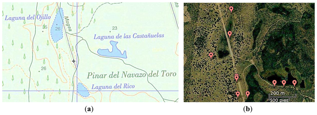 Based on our previous experience in WSNs, in 2010, we deployed a WSN to solve a specific problem that the biologist had in Doñana (Figure 6): monitoring the flood level in marsh areas. This network was called ICARO 1. The ICARO 1 network is composed of ten wireless sensors that are deployed between the zone of “El Ojillo” and “El Zacallon” [15]. This network works on the 2.4 GHz ISM band using the IEEE 802.15.4 Protocol. Figure 6 shows a map with the current deployment of the system. The maximum distance between the nodes is 200 m.