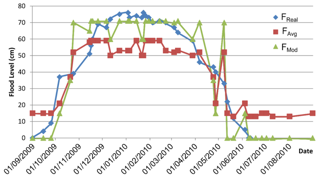 After its deployment in 2010, the experimental results obtained under various scenarios have demonstrated good performance of the system and have validated the results that were obtained by simulation. This arrangement is depicted in Figure 8, where FReal represents the real flood level, FAvg represents the flood average estimation and FMod represents the flood mode estimation.