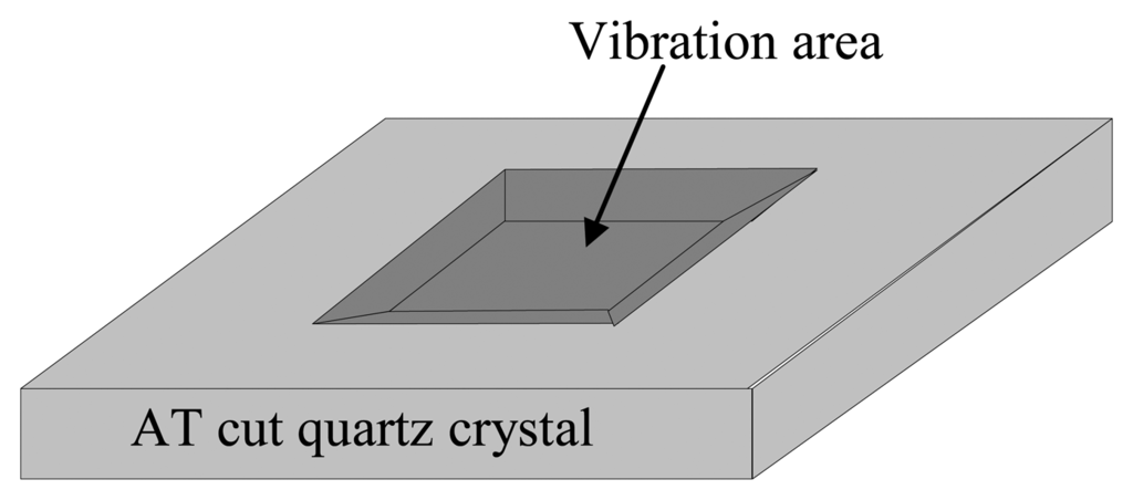 where t is the quartz crystal thickness. Equations (1) and (2) clearly show that reducing the quartz crystal thickness should enhance the QCM sensitivity. However, in practical manufacturing processes and applications, the minimum thickness is limited by the mechanical strength of the crystals. High frequency TSM resonators are usually fabricated by thinning the central area (i.e., the vibration area) with an inverted-mesa structure using photolithographic and etching techniques. Only the thinned central area vibrates, while the original thickness of the outer ring is retained to supply the necessary mechanical strength for handling and assembling. High fundamental frequency QCMs have been the subject of significant research interest from 1993 to the recent past [28]. Using the QCM in a liquid environment produces an unstable vibration, because the liquid flow deflects the vibration quartz membrane. Thus, the thinned vibration area should be manufactured as small as possible, because a small area membrane has a relatively high bending strength. A circular design is usually used for the central thinning area, and the inverted-mesa structure is fabricated using a wet etching process. However, a miniaturized thin vibration area is difficult to manufacture because of the complexity of the etching side wall profile in the wet etching process [9]. The most successful reports to date on miniaturized high frequency QCMs have used a deep reactive ion etching process (DRIE) to produce vertical side walls [912]. However, DRIE is an expensive process that requires special etching equipment. The objective of this study is to manufacture a miniaturized high fundamental frequency QCM using a cheap wet etching process. In this research, a simpler side wall profile is obtained by using a rectangular design for the vibration area instead of a circular design (see Figure 1). This research is motivated by the well known result that the etching side wall profile of a quartz crystal is highly dependent on the crystal orientation. Using a resonator as a QCM sensor does not require strict control of the resonating frequency, unlike for resonators used in communication industry. In this case, the frequency shift caused by the mass change is more important than the fundamental frequency; thus we can perform this experimental study without first performing a complicated 3-D simulation. A TSM resonator with fundamental frequency of 622-MHz and a rectangular etching structure has been used in industry [13]. Using a rectangular etching area may enhance the control and predictability of the vibration area. The QCM fundamental frequency (i.e., as determined by the etching area thickness) is controlled by the etching time.