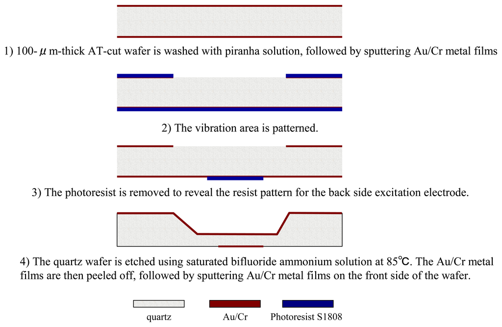 To facilitate mass-production and lower the fabrication costs of QCM chips, the design area of a single QCM chip is set at 4 × 4 mm2. The design etching area is 1.2 × 1.4 mm2. The initial AT cut wafer is 100 μm thick (to produce the resonance at 16.7 MHz frequency). The design dimensions of the excitation electrode on the front side of the chip range from 200 to 800 μm in diameter with a 100-μm interval. Figure 2 shows the detailed microfabrication process: (1) the quartz wafer is washed using a piranha solution (H2SO4: H2O2 = 3:1) at 110 °C, followed by sputtering Au/Cr (100 nm/40 nm) bi-layer metal films onto the wafer to form an etching mask; (2) Au/Cr metal layers are patterned on the back side of the wafer, followed by photoresist removal; (3) a resist pattern is formed on the front side of the wafer to serve as the front side excitation electrode; (4) the quartz wafer is wet-etched using a saturated ammonium bifluoride solution at 85 °C, followed by Au/Cr etching and photoresist removal treatment; (5) Au/Cr is sputtered on the back side of the wafer to form the back side excitation electrode.