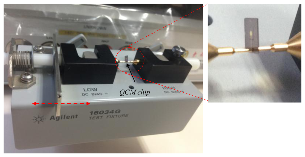 The vibration characteristics (i.e., the Q value, the equivalent circuit parameters, and the condition of the spurious modes near the primary TSM vibration) of the fabricated QCMs are directly evaluated by using an Agilent 4294A impedance analyzer with a 16034G test fixture, as shown in Figure 3. The sweep number is set to 800, and the scanning precision is set at the highest possible value. A flow cell is designed and fabricated to ensure that the chip can be used in practice as a bio- or chemical sensor in a liquid. The custom-designed flow cell consists of a PDMS cover, a thin silicon resin layer, and a PMMA substrate as shown in Figure 4. Liquid can be introduced through inlet and outlet ports in the PDMS cover. The silicon resin layer functions both as a sealing material and a cell chamber. A 100-μm deep cavity is created in the PMMA substrate to stabilize and hold the QCM chip. The excitation electrodes on the two sides of the chip are guided out using two spring-pins, each of which is fixed into a PDMS and PMMA substrate. A simple labview-based program is developed for data acquisition to examine the frequency stability and noise level.