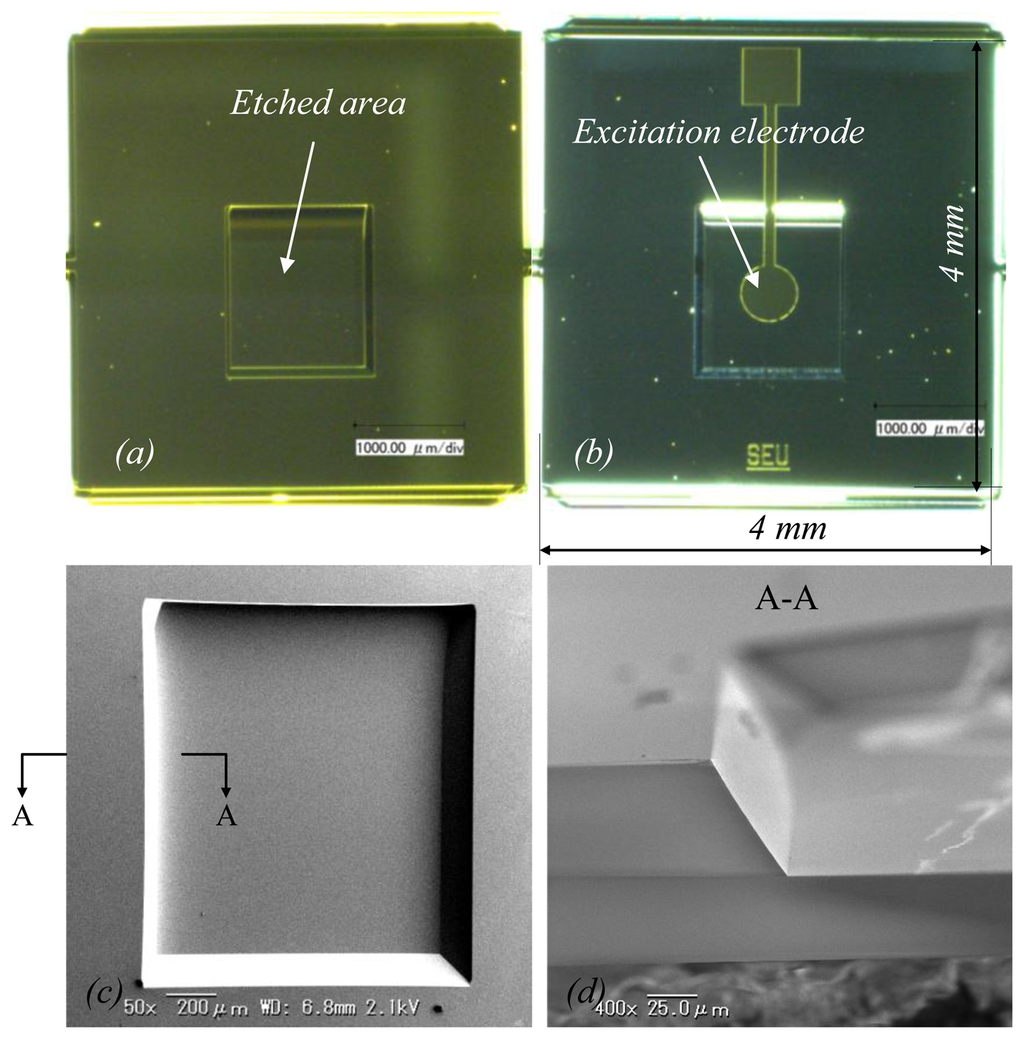 HFF QCMs of 47 MHz, 60 MHz, 73 MHz, and 84 MHz were obtained. Figure 5 shows a fabricated QCM. Figure 5a,b is optical images of the top view and back view of the QCM, respectively. Figure 5c is a close-up image of the etched rectangular area, and Figure 5d is a representative image of the etched side wall profile, which is much simpler than in the circular version.