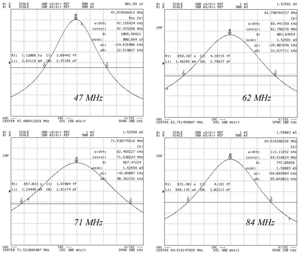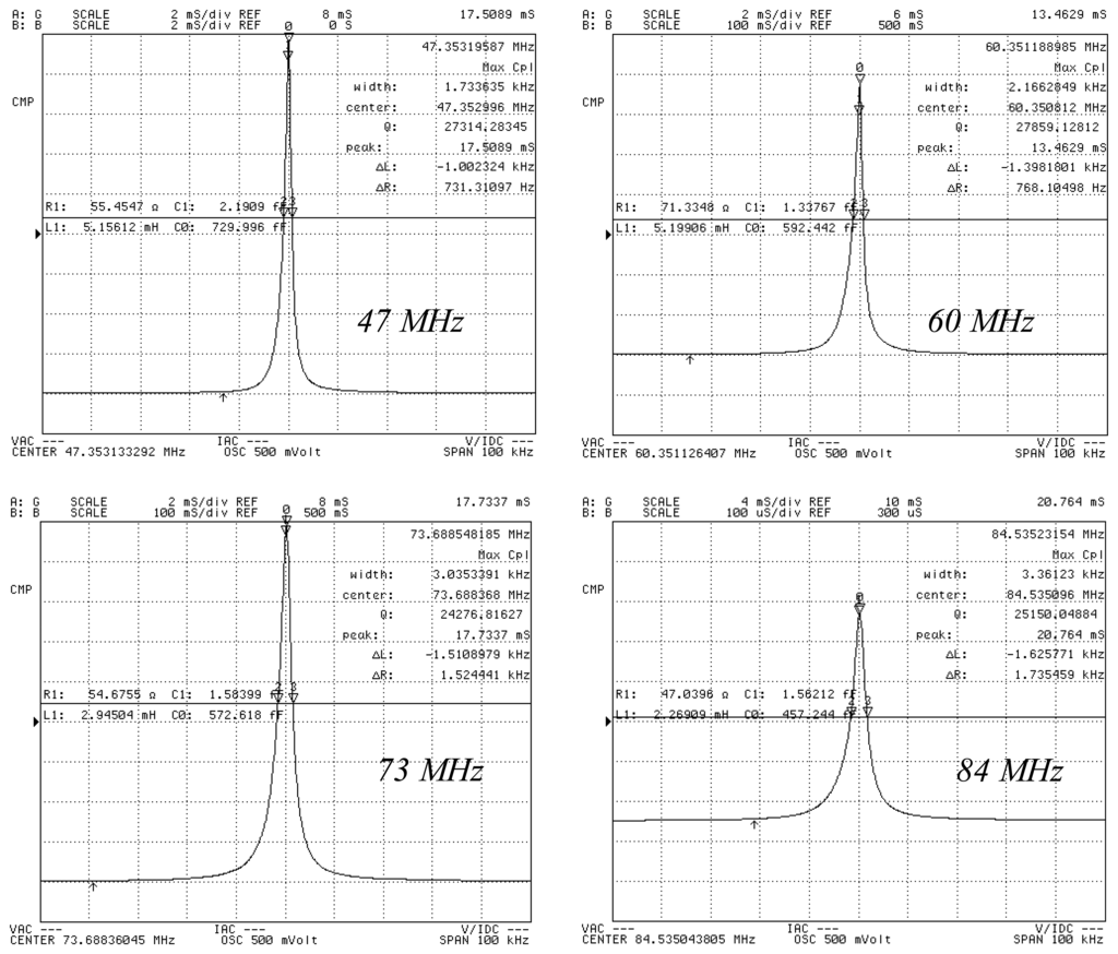 Figure 6. Typical measured vibration characteristics for 47 MHz, 60 MHz, 73 MHz and 84 MHz resonators.