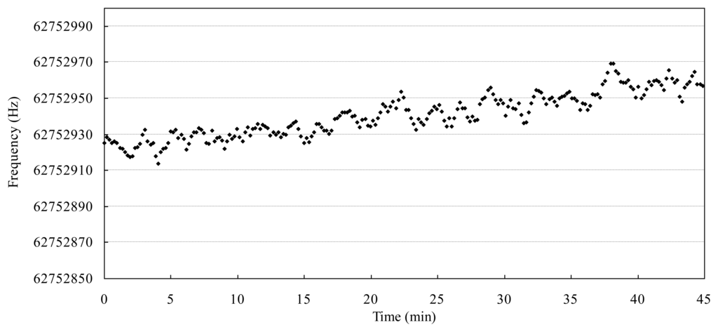 Figure 9 shows the measured frequency fluctuation of a 62 MHz resonator via 16,034G test fixture in air and room temperature. The frequency noise (defined as the standard deviation of frequency fluctuation) is measured to be 5 Hz over a period of 600 s (50 points) and the frequency drift (peak to peak) is about 50 Hz over a period of 45 min. The measured noise is higher than the previous reports [6,8,11], although the resonator has the similar mechanical vibration characteristics. Now we are making efforts to reduce the noise level in the following considerations. Firstly, a temperature stabilized chamber is needed to improve the unavoidable temperature noise and drift, which is usually used for precise measurement as above mentioned reports. Secondly, the data processing method should be developed instead of the commercial impedance analysis method [11,15]. Finally, a low bandwidth oscillator circuit is preferred instead of a broadband impedance analyzer [6,16].