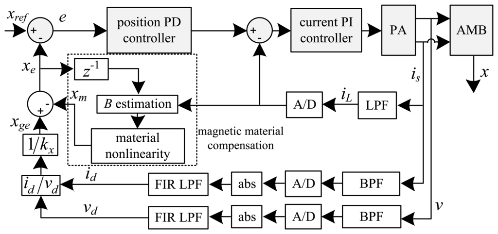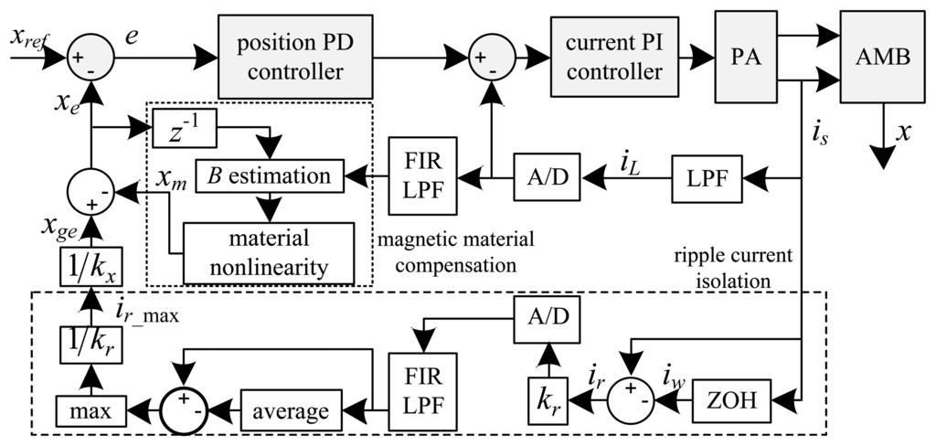 The ZOH isolates the working point current (iw) at the beginning of the measurement cycle. Subtracting iw from the actual sensed current is isolates ir. The ripple component is amplified by kr to the full range of the analog-to-digital (A/D) converter. Equation (5) is then implemented using the amplified ir in place of is. The average of krir over the measurement cycle is subtracted from krir before taking the maximum and rescaling to obtain ir_max. The estimated position is subtracted from the reference position to produce a position error, which is fed to the position controller. The current controller then generates the appropriate correction signal for the amplifiers using the control error. A low order finite impulse response (FIR) filter is implemented after the A/D converter to reduce the high frequency switching noise. The filter does introduce some unwanted phase-shift, but the cut-off frequency is chosen well beyond the sensor bandwidth at 20 kHz. An FIR filter is considered since a linear phase-shift for the frequency response is possible. Furthermore, classical position and current controllers are used to achieve stable suspension of the experimental AMB rotor, thereby demonstrating its feasibility for industrial application.