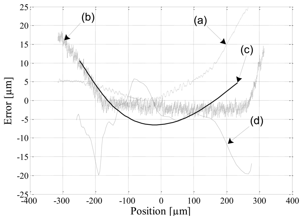 The static performance of the position estimators are judged in terms of sensor linearity for static position disturbances and currents. The desired position is linearly varied from −250 μm to 250 μm under open loop conditions with a constant bias current of 3 A. Figure 12 shows the errors between the simulated estimated positions compared to the output of the TSM, and a comparison between the experimental estimated positions and the reference sensors. In the figures, the following referencing notation is used: (a) simulated modulation self-sensing; (b) simulated DCM self-sensing; (c) experimental modulation self-sensing; and (d) experimental DCM self-sensing.