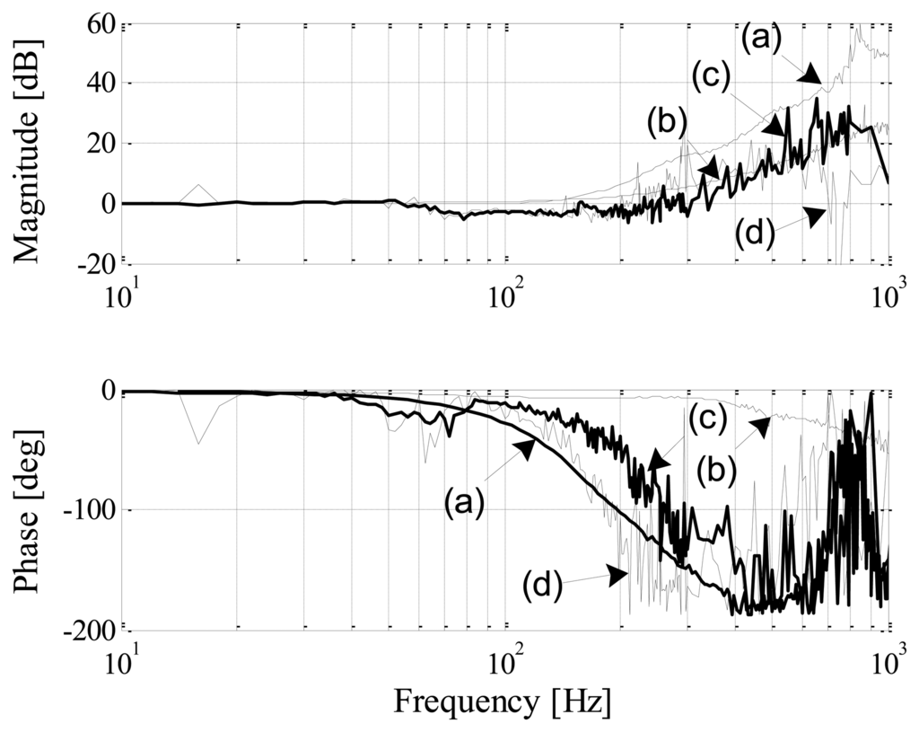 Figure 13 shows the frequency response of both the simulated and the experimental estimated positions with regard to the reference position. The AMB is perturbed with a 10 μm peak-to-peak sinusoidal position reference at different frequencies.