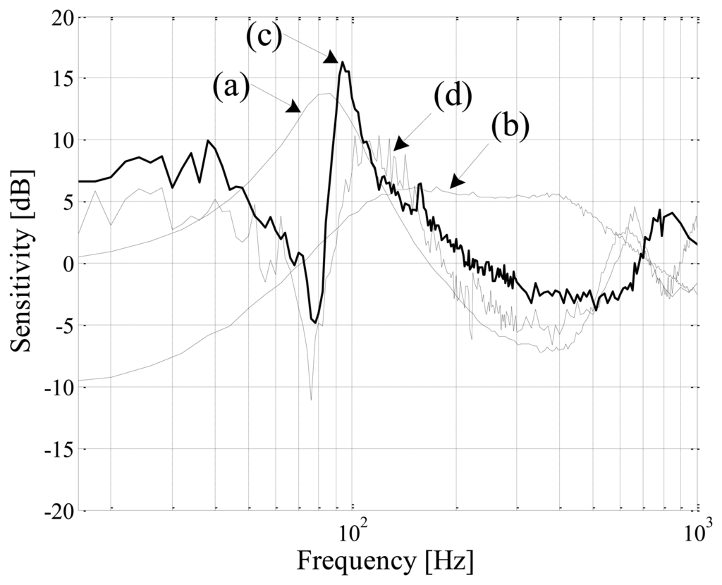Magnetic bearings are inherently unstable and require feedback control to operate in a stable equilibrium [18]. The sensitivity function evaluates the robustness of the AMB control for parameter variations and disturbance forces. However, established robustness indicators do not yet exist for self-sensing AMBs [11,19]. The analysis is performed according to ISO 14839-3, which documents the sensitivity analysis for AMBs with standard displacement sensors. The rotor is suspended with the estimated position, after which a 7 μm peak-to-peak sinusoidal position reference with varying frequency is applied. The tests comprise stationary rotor conditions to facilitate evaluation of AMB performance independent from factors such as rotor circularity and unbalance that come into effect when the rotor is spinning. Figure 14 shows the sensitivity functions when the rotor is suspended with either the simulated or experimental estimated position.
