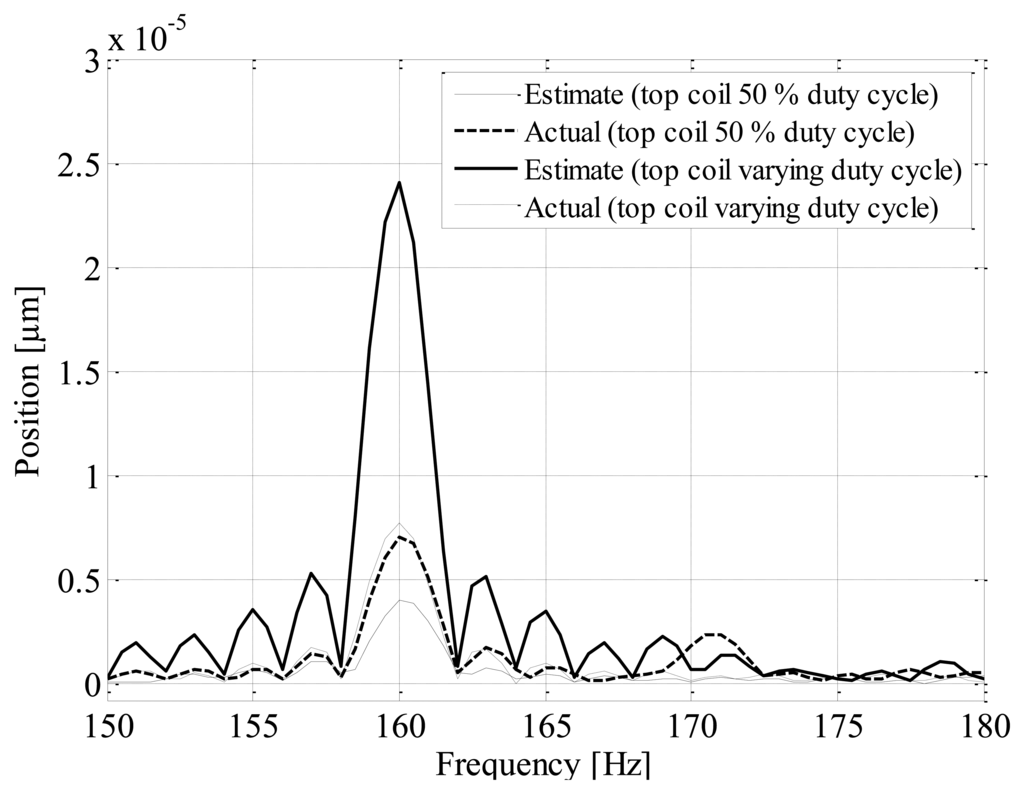 Figure 15 presents FFT plots of the estimated and actual positions for the cases described. The figure shows that for case 2 cross-coupling effects cause an error of approximately 300% when compared to the actual position. The results demonstrate that for the case where a 50% duty cycle is applied to the top coil during the measurement cycle, the effect of cross-coupling is partly attenuated. Similar results for different bias currents and frequencies confirm this observation [13].