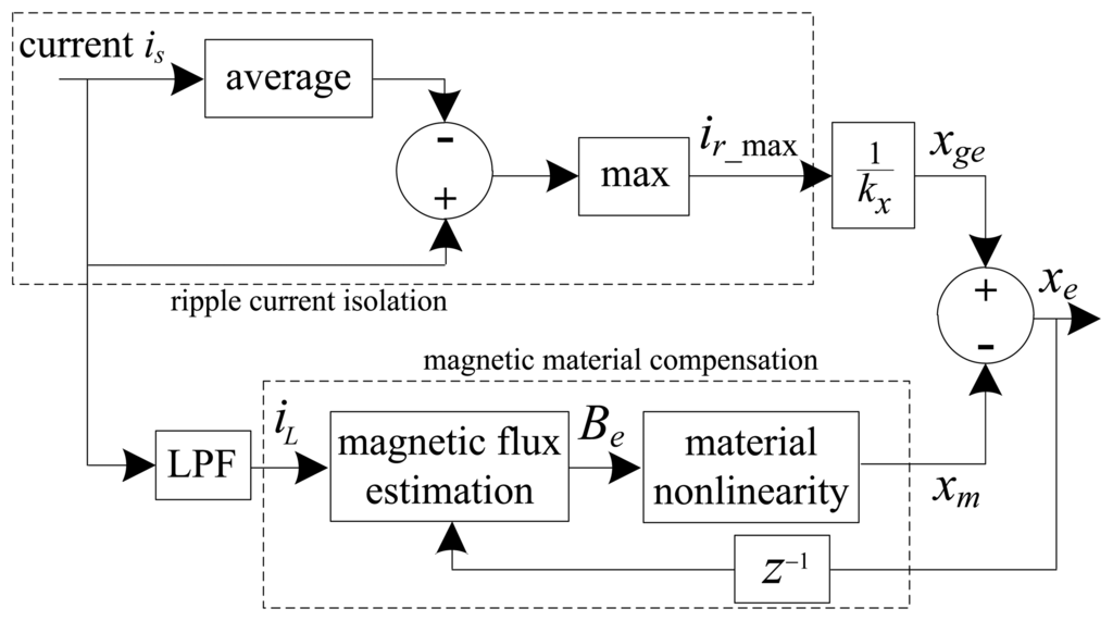 In order to facilitate a stability analysis of the self-sensing algorithm, the position estimation loop must be linearized. The nonlinear compensation function fm(B) = k2B2 + k1B + k0 is linearized around the nominal low-pass filtered current (iL0) and the nominal rotor position (g0), given by: