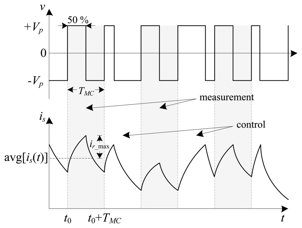 In modulation self-sensing, the high frequency current ripple is isolated by passing the measured current through an analog BPF or high-pass filter (HPF) [2,3,8,9]. This work proposes an alternative technique where the peak ripple current is deduced during a single measurement cycle (TMC) from the raw coil current waveform by subtracting the average coil current over the whole switching period from the measured raw coil current is. The maximum amplitude of the current ripple is given by: