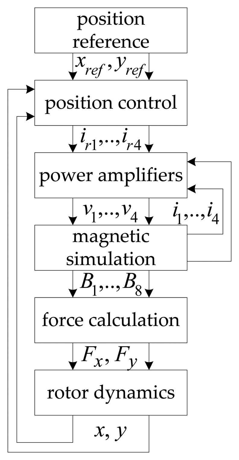 In Figure 6, the TSM receives x-and y-axis position references, which are compared to the actual rotor position. The position controllers generate current references for the voltage mode current controlled PAs. Next, the magnetic model receives the PA voltage signals to determine the bearing coil currents as well as the magnetic fluxes. Current signal feedback facilitates PA current control. The resulting x and y rotor forces are determined using the magnetic fluxes. Finally, the movement of the rotor is modeled by applying the magnetic fluxes to a point mass model.