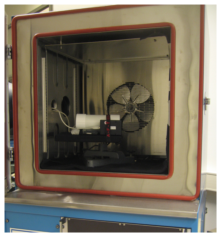 The temperature stability of the SQMs was tested by installing them inside of a programmable temperature chamber (Weiss Umwelttechnik, 125SB) designed for materials testing. Two devices were tested simultaneously, one free and one in the standard Unihedron housing as shown in Figure 2. One porthole allowed the passage of cables into the chamber, another one was left open and exposed to light from a stable, diffuse source (integrating sphere by Lichtmesstechnik Berlin). To reduce the radiance to typical values for an urban night sky, the light from the integrating sphere was incident on a dark curtain hung inside of a temperature chamber. The SQMs were manually arranged to ensure a starting radiance between 18.9 and 19.1 magSQM/arcsec2. The stability of the light source was verified by monitoring the SQMs over a period of several days with the power to the chamber off (i.e., room temperature). No variation in measured radiance was observed in either of the two SQMs.