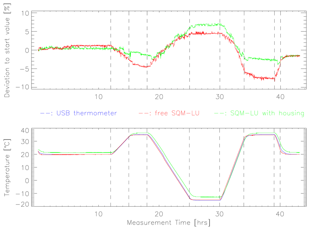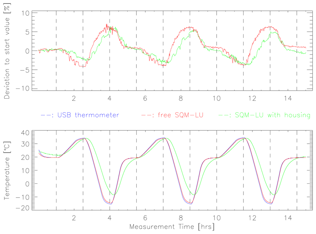 The response of the light sensor of the SQM (TAOS TSL237S) has a well characterized bias with temperature, which is reported by the manufacturer. The SQM's internal software attempts to account for this bias by monitoring the temperature near the light sensor, and correcting the observed signal according to the expected bias. The temperatures that can be expected to be encountered by an SQM in the field will depend on the measurement location and time of year. In the period from 1 April 2010 to 19 August 2013 in Berlin, Steglitz, an SQM-LU mounted on the roof of our institute observed a temperature range from −16.5°C to 30.3°C during darkness. The median rate of temperature change was −0.3°C/h, and the most extreme rates of temperature change observed were −9.0°C/h and +2.6°C/h.