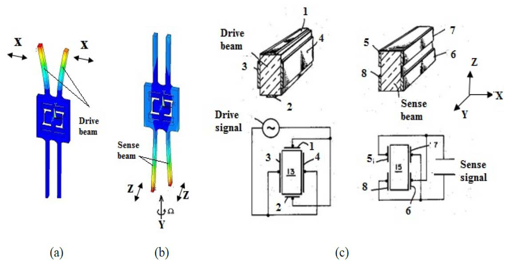 The quartz gyroscope is an important sensor used in various civil and military applications [1–6]. For most quartz gyroscopes, the drive mode is the fork or beam's vibration in the x-axis orientation and the sense mode is the vibration in the z-axis orientation, while the input angular rate is in the y-axis orientation. The drive mode, sense mode and electrode distribution of a typical quartz gyroscope are shown in Figure 1a–c.Two parallel independent sense electrodes on each sidewall of the sense beam (in Figure 1c, parts 5 and 8 as well as 6 and 7 are separated) are required to gather the charges induced by the sense mode. However, the whole thickness of the quartz tuning fork is about several hundred micrometers, so performance of the sensors is affected by fabrication errors and it is difficult to deposit complicated electrode patterns [3,4]. Therefore, many researchers are working to explore a comprehensive approach to reduce the process difficulties and to improve the performance of the sensors [7–9]. In this paper, a type of z-axis gyroscope is introduced. It is fabricated using the quartz anisotropic wet etching process. Details about the structure design, fabrication process, readout circuit, and characterization of this kind of gyroscope are presented.
