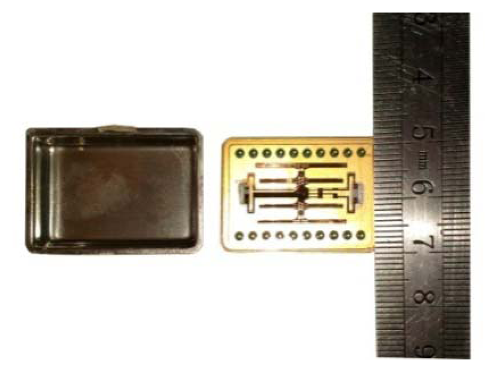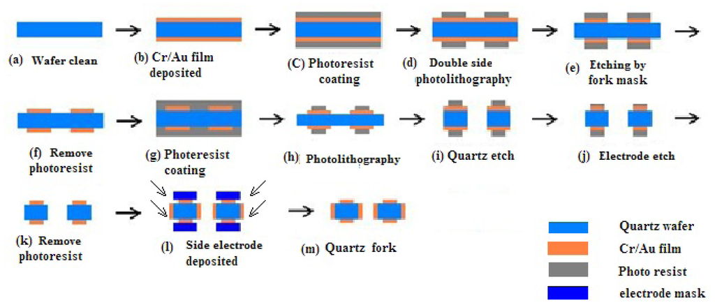 The fabrication process is shown in Figure 9 [14]. The prototype gyroscope is fabricated using a surface polishing z-cut quartz wafer with a thickness of 500 μm. Two masks are prepared for the quartz fork figure and the electrode figure, called the quartz fork mask and the electrode mask respectively. The quartz gyroscope can be realized by the quartz anisotropic wet etching process. After the quartz wafer is cleaned (Figure 9a), Cr/Au films are deposited on the double surface, in which Cr film is used to add the adhesive force (Figure 9b). Double side photolithography and etching are used to make the Cr/Au mask, and the quartz fork mask is used during the photolithography (Figure 9c–f). Then double side photolithography method is used again to form the electrode pattern. The electrode mask will be used (Figure 9g,h) during the photolithography. A mixture of HF (40 wt % aqueous solution) and NH4F (40 wt % aqueous solution) (concentration ratio of the HF and NH4F is 1:2) is used to etch the quartz at 50 °C for 48 h. Long etching time can give rise to good etch result, while it is limited by the Cr/Au films adhesive force on the quartz wafer (Figure 9i). After the Cr/Au films are etched to form the electrode pattern, photoresist is removed (Figure 9j,k). Then side electrodes are deposited by vacuum sputtering coating with an angle (Figure 9l,m). Finally, the structure is mounted on a pedestal with epoxy and electrically connected to the surrounding electronics with Au wire bonding. The whole fabricated device is shown in Figure 10.