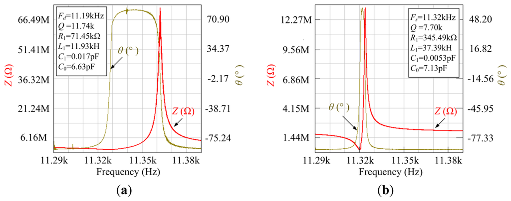 From Figure 11, it can be seen that the drive mode frequency Fd and the sense mode frequency Fs are measured to be 11.185 kHz and 11.320 kHz, which are similar to the theoretical analysis and simulation results. The Q factor of the drive mode and the sense mode is calculated to be 11,735 and 7,697 without vacuum packaging. The values of the drive mode and sense mode are shown in Table 3.