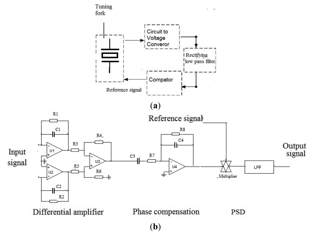 The signal detection method is shown in Figure 12 [15]. The differential amplifier is used to eliminate common mode noise. The optimal phase relationship between reference and input signals can be obtained in the phase compensation; while, the angular rate signal is demodulated using phase sensitive demodulators (PSD).