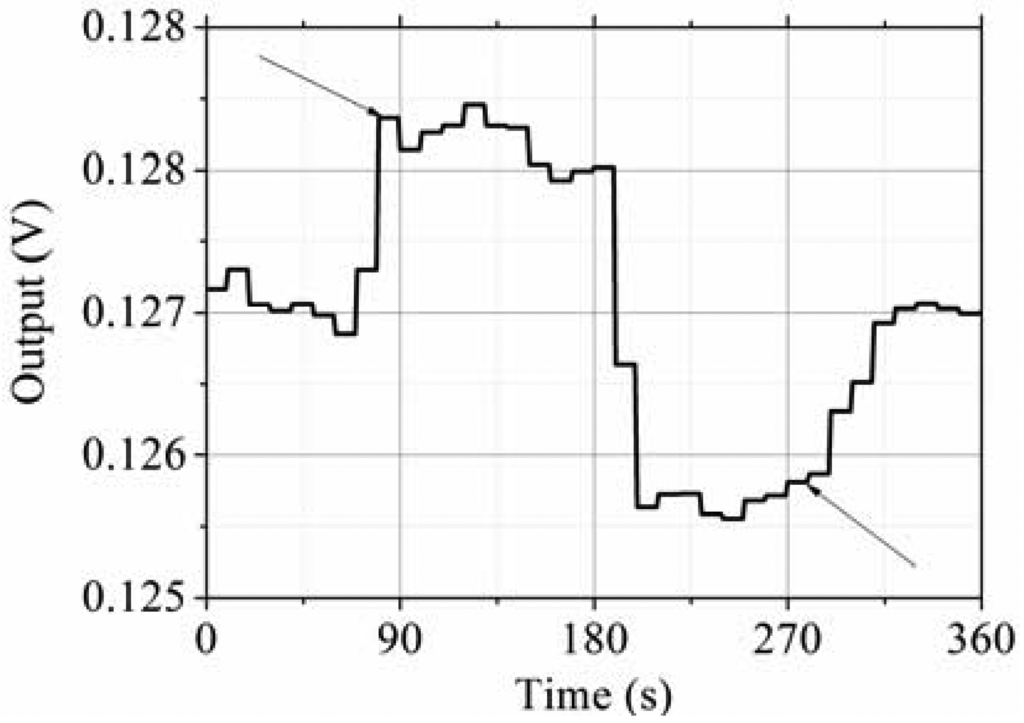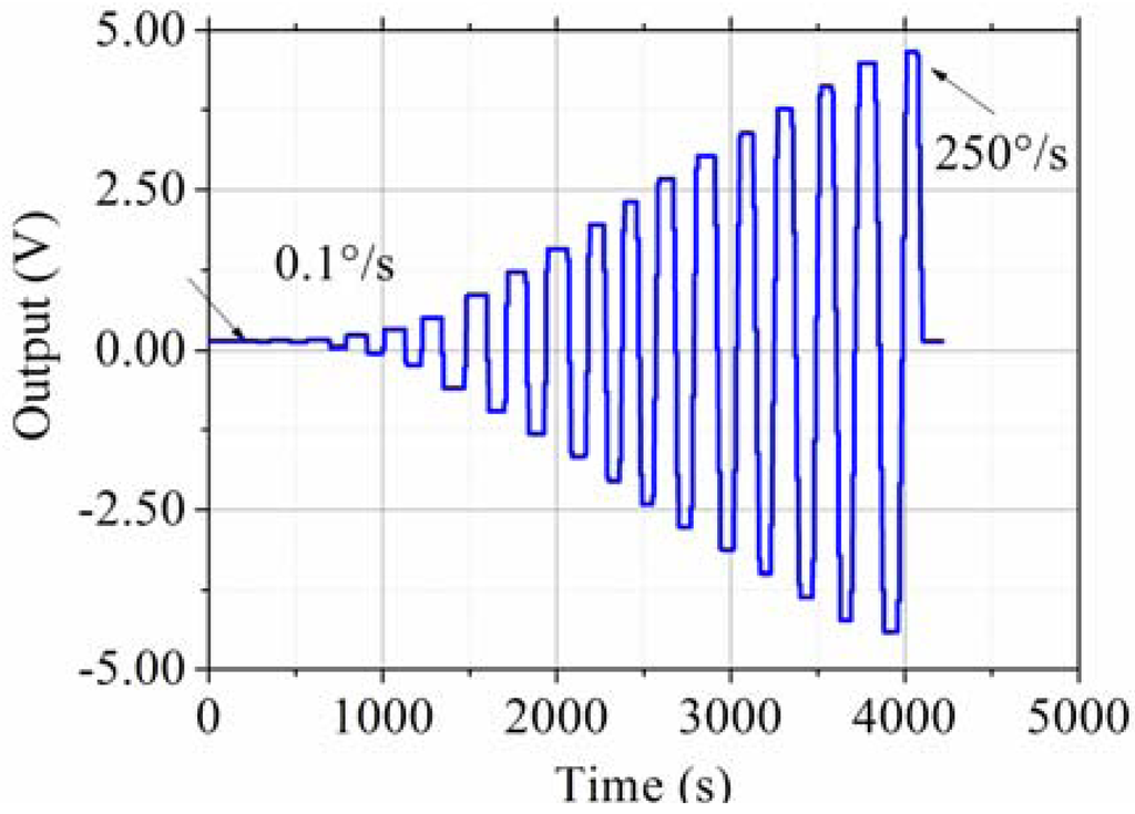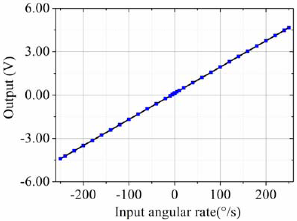 The testing system is shown in Figure 13. The prototype is put on the rate table, the data is obtained by the data acquisition device at a sampling rate of 10 times the bandwidth, and the data is averaged to one value per second. The different input rates were from ±0.1 °/s to ±250 °/s, and the output voltages are recorded. The measured scale factor was 18.137 mV/(°/s) and the nonlinearity was 0.40% under a full-scale input range of ±250 °/s. The test results are shown in Figure 14 and statistical results are shown in Figure 15. The output with ±0.05 °/s angular rate input in shown in Figure 16, showing that the sensitivity is higher than 0.05 °/s.