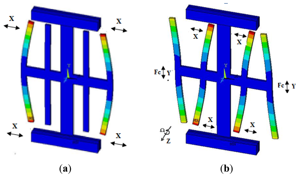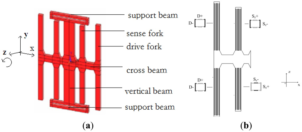 When the drive forks are driven, a vibration is induced along the x-axis based on the inverse piezoelectric effect, while an opposite vibration occurs on the four drive forks in x-axis direction. The drive mode is shown in Figure 3a. When the angular rate is applied on the z-axis, the Coriolis force can make the cross beam move up or down leading to vibration in the sense mode as shown in Figure 3b. The bending of the sense forks in the x-axis can generate a charge because of the piezoelectric effect, which is proportional to the Coriolis force and detected by the sense electrode. The angular rate can be obtained by demodulating this charge signal.
