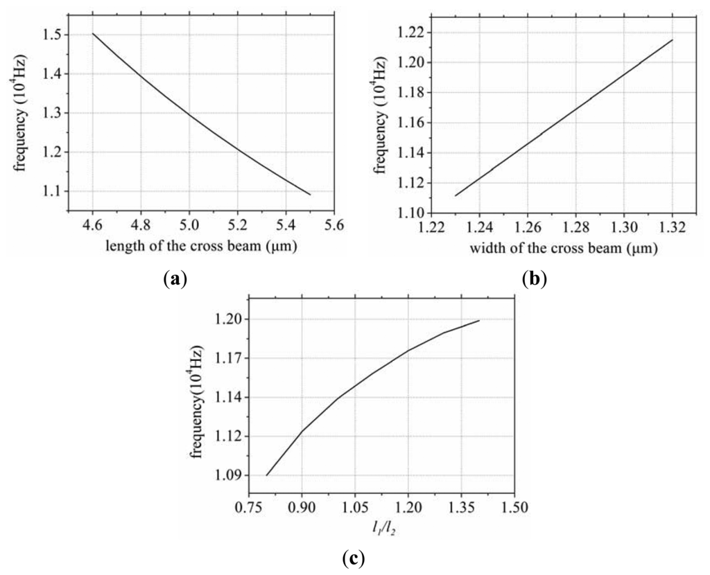 As the length of the cross beam increases the sense mode frequency will decrease. As the width increases the sense mode frequency will increase. As the l1:l2 ratio increases the sense mode frequency will increase.
