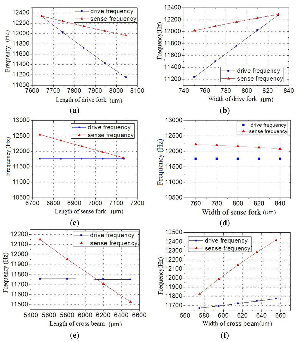 It can be seen from Figure 6a,b that the dimension change will affect the drive mode frequency and sense mode frequency. The drive mode is more sensitive to the dimension change than the sense mode. Figure 6c,d show that the dimension changes in the fork affects the frequencies. A change in the sense length has no influence on the drive frequency, but it changes the equivalent mass and sense frequency. In Figure 6e,f the results of the change in the cross beam dimensions on the frequency are shown. The dimension changes of the cross beam have a greater effect on the sense mode frequency than on the drive mode frequency.